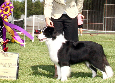 Multi-Group Placing, Multi-Regional and National Specialty AOM, BISS Ch.X BorderIsle Charmed By Ewe, HSAs, HIAs, HTAD-1,2s, HRD-1s, STDs, RHIT Ch. Outburst Watch Me Stalk Ewe X BISS Ch. Tainsh's A Toast to Ewe (OFA #BCO-6076E28F-PI Excellent, #BCO-EL912F28-PI Normal; CERF BCO-3259/2011-45 Clear; Optigen CEA Carrier, Optigen CL Normal, TNS Carrier) Sadie is a truly exceptional Border Collie, and a terrific companion dog. She is the queen of my heart and our home. Along with striking good looks and superior conformation, she has a fantastic want-to-please, always attentive attitude and is a natural show dog. She is an avid competitor in any event, and is the sort of dog that doesn't merely retrieve the ball or Frisbee, she has to do it with style and flair, and at top speed. She has natural athletic ability with impeccable timing and coordination, and a never quit work ethic. See more photos of Sadie here. Here are some of Sadie's career highlights: GCH title spring of 2011 AOM 2010 BCSA National Specialty, Crufts Qualified 2011-2012, thank you to long-time UK breeder-judge Kathie Kinton, Kinnaway Border Collies, Northhamptonshire, for finding a completely uncoated Sadie among the largest entry of Border Collies at any US National. AOM 2010 BCCGLA Regional Specialty, thank you to long-time breeder-judge Kelly Whiteman of Bonni-Dune Border Collies BOS 2009 BCCGLA Regional Specialty, thank you to long-time Texas breeder-judge Barbara Palmer of Blue Chip Border Collies AOM 2008 BCCGLA Regional Specialty, thank you to world-renowned breeder-judge Helena Fitzgerald, Borderfame Kennels, Perth, Australia BISS 2006 BCCGLA Regional Specialty, thank you to judge Peri Norman HIAs title with 2nd place & 5th places, Spring Chute Out, and 3rd leg & title at the 2008 BCCGLA Spring trial as well as 2 HSBs legs with 2nd & 5th placements and High Scoring Ch. of Record. Feb., 2008 Wags for Wishes herding trial BOB & Herding Group 3, Kachina KC, 10/15/07. Sadie's very first show back from maternity leave resulted in a BOB & Group 3!! Thank you breed and group judge Monica Canestrini for the wonderful placement and the lovely comments! March 18, 2007, litter whelped to Imp. HC Shep, HXAs, HIBs, HXBd of Rising Sun Farms, 3 males 2 females 2006 Rankings #15 Canine Chronicle Breed Ranking #16 Canine Chronicle All-Breed Ranking #13 in the 2006 Eukanuba Top 25. Titles earned: STDs, HRD-1s, HTAD-1s, HSAs and RHIT HTAD-1s with a 1st & 2nd placements HRD-1s with a 1st and 4th placements HSAs in 3 trials, with a 5th place and a score of 96, a second leg just out of the ribbons with a score of 91, and finished her title with a score of 86, 2nd place, and Reserve High in Trial. WOW! I am very proud of our accomplishments, especially for a green dog and a first-time handler! BISS 2006 BCCGLA Specialty Show ASCA Started Trial Dog title on sheep. WB, 5 pts., new Ch., 2004 BCCGLA Specialty. Sadie finished her Ch. undefeated from the 6-9 class, in 5 shows (3 weekends) with 4 straight majors (4,3,3,5), and 2 BOB. Her dam, BISS Ch. Tainsh's A Toast to Ewe (Corky) was a Pedigree Top producer in 2004, with four out of six in Sadie's litter finishing that year. |